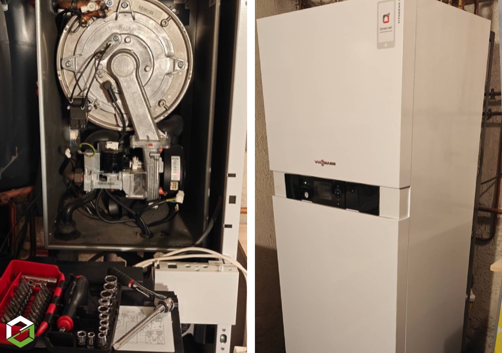 - Pose chaudière gaz (condensation) + raccordements chauffage / ECS